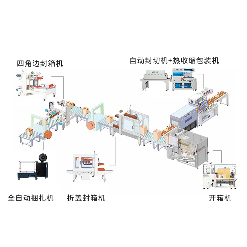 全自動(dòng)封切收縮機(jī)+動(dòng)力滾筒+開(kāi)箱機(jī)+折蓋封箱機(jī)+四角邊封箱機(jī)+全自動(dòng)打包機(jī)(可任意定制)